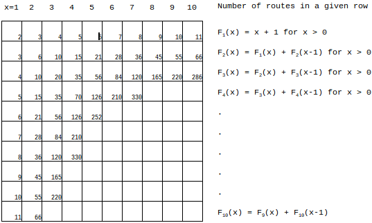 You're not really supposed to share solutions, but a) this is more of a procedural explanation, b) my way isn't necessarily the quickest or the most intuitive, and besides, c) nobody reads my blog. So I'm going for it. I started by brute forcing my way to find the number of routes through the first few cells, then did some fiddling with formulas to determine the number of possible routes to each intersection in a given row. It looked like this, but messier: